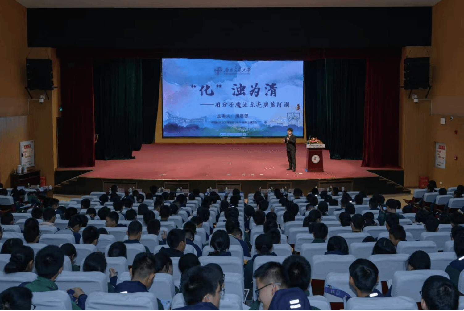 胡远思以《“化”浊为清:用分子魔法点亮碧蓝河湖》为题作首场讲座。他从中学化学基础知识出发,结合其在环境治理领域的前沿科研实践,生动展示了专业知识如何服务于“美丽中国”建设。他将复杂的治理原理转化为易懂的“分子魔法”,极大地激发了在场学生对科学探索与环境保护的浓厚兴趣。