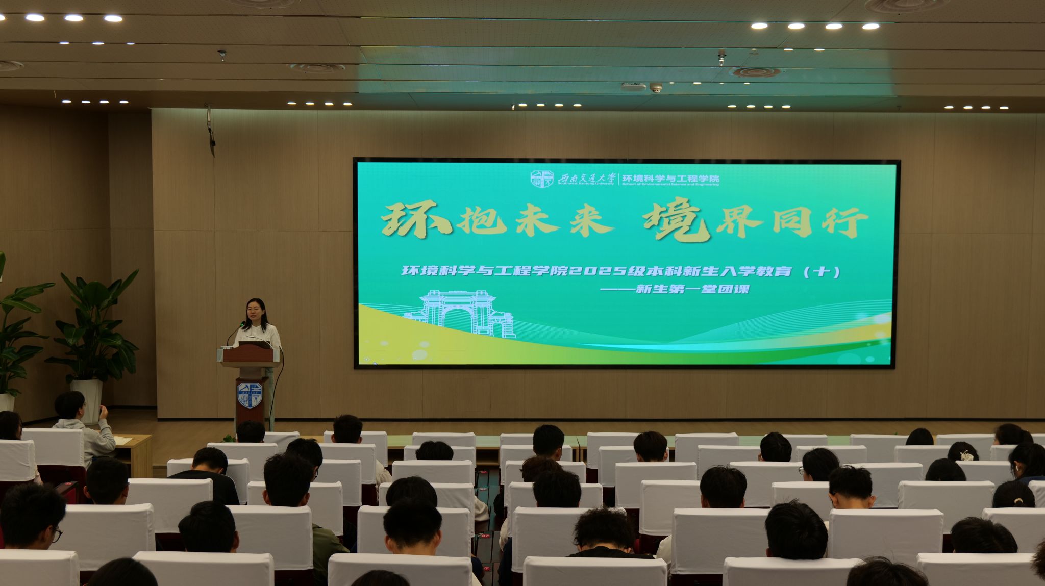 为帮助本科2025级新生快速适应大学学习生活,明确学业目标,合理规划成长路径,1016日,亚洲成人在线 环境亚洲成人在线 于图书馆二号报告厅举办“环抱未来,境界同行”新生第一堂团课。本次团课由环境亚洲成人在线 团委书记翟琦主讲,学生辅导员曾祥珂、向斐与2025级全体本科新生共同参与。